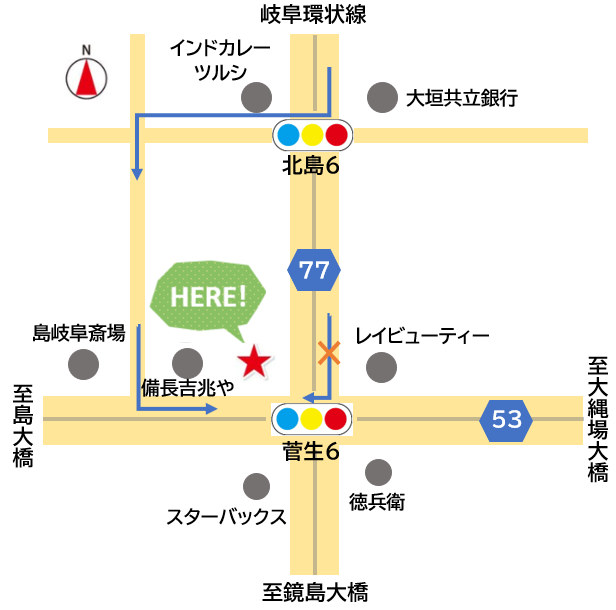 岐阜環状線沿い・岐阜駅より車で15分・西岐阜駅より車で10分・菅生6丁目バス停より徒歩2分・島小学校前バス停より徒歩10分